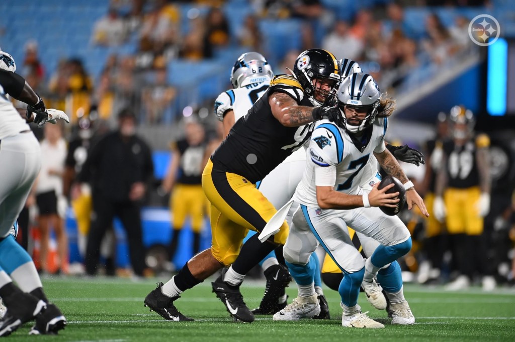 As frustrated as they must have been in their defense, the coaches didn’t do many favors to the guys trying to keep their jobs. At one they point made the baffling decision to combat a 5-wide set with their base 3-4 defense. PJ Walker threw to a TE over the middle of the field who dropped the pass, but clearly the scouting report is out on Steelers linebackers in coverage.